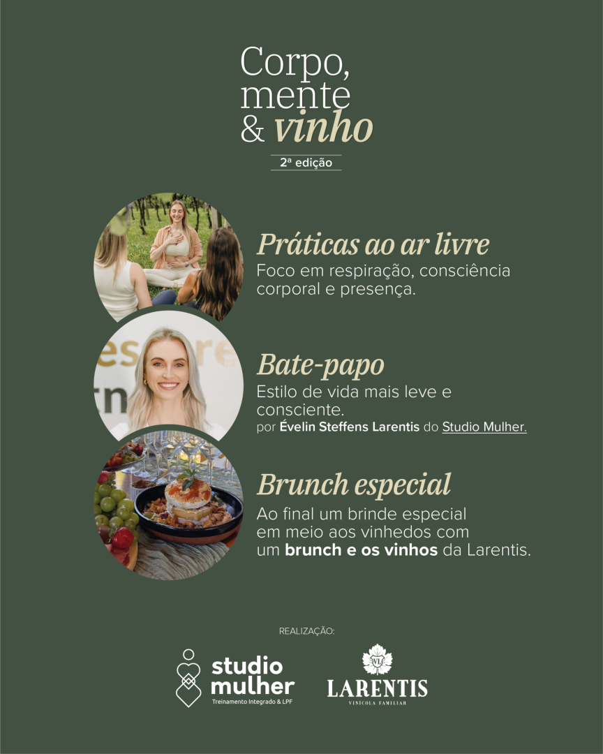 Para finalizar com ainda mais sabor e autenticidade, um BRUNCH especial te convida à pausa, a compartilhar experiências, a trocar impressões e a brindar juntas com os vinhos Larentis — onde tomar um vinho não é culpa, é celebração. Uma pausa merecida!